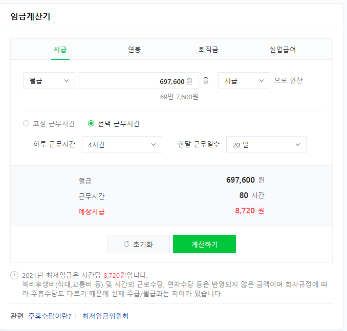 만약 시급이 8,720원이고 하루에 4시간씩 한 달에 20일을 근무하게 된다면 아래와 같이 나오게 된다. 한 달에 697,600원을 임금으로 받게 되는 것이다.