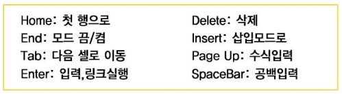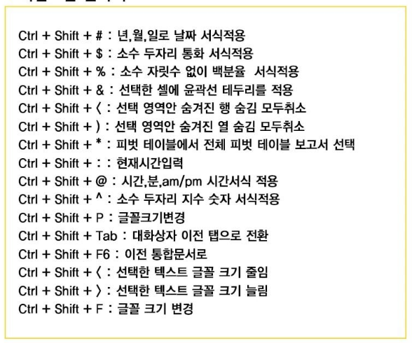 - Ctrl + Shift + & : 선택힌 셀에 윤곽선 테두리를 적용