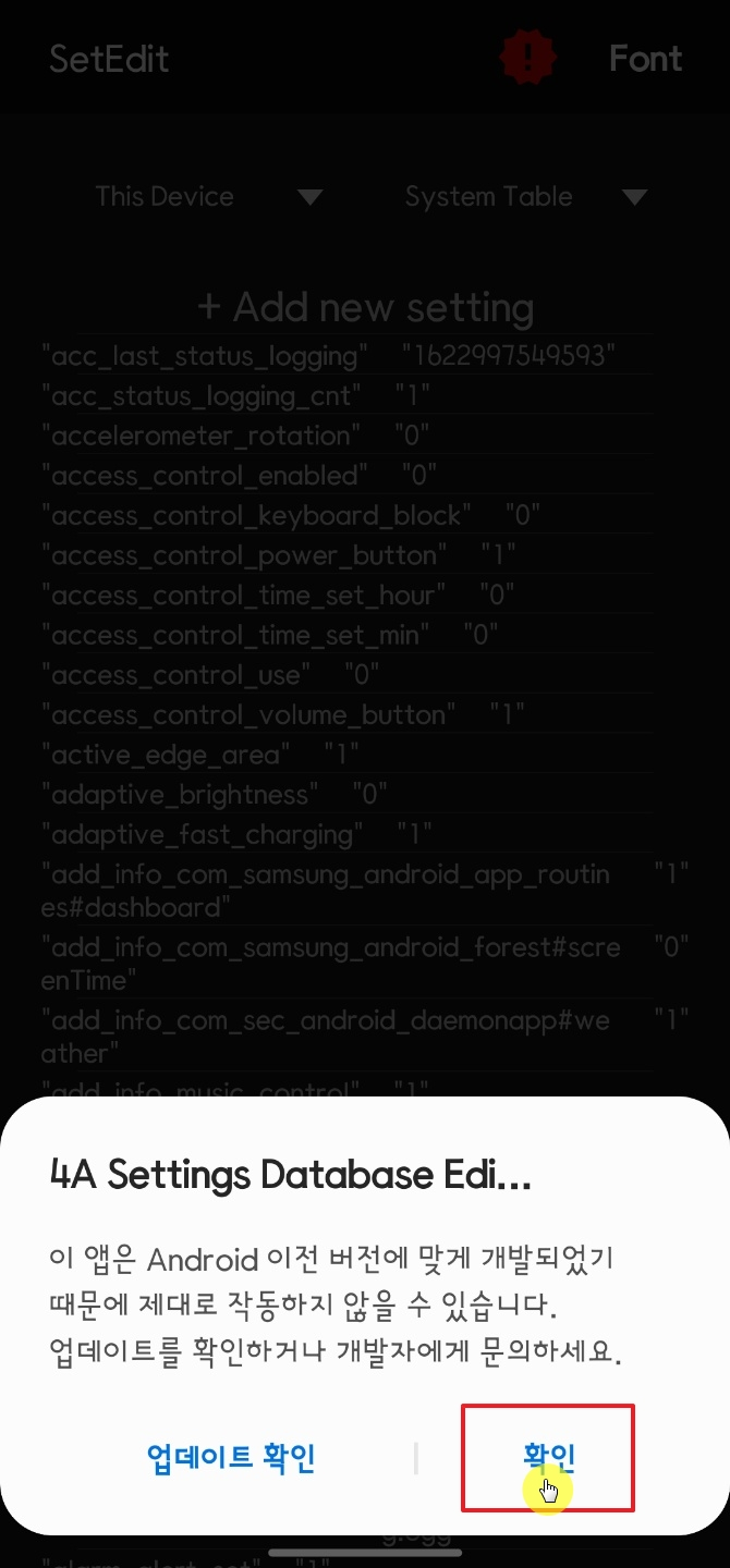 설치가 완료되면 열기를 터치해서 SetEdit 앱을 실행해준다. 앱이 실행되면 오른쪽 사진처럼 메시지가 드는데 확인을 터치한다.