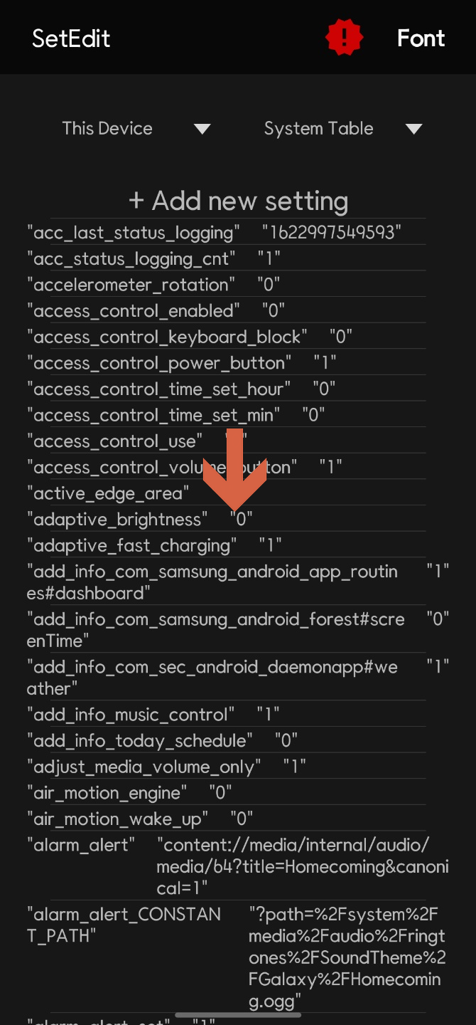 이럴 때는 앱 실행 시 상단에 있는 "+Add new setting"을 터치해서 csc_pref_camera_forced_shuttersound_key 항목을 만들어 주면 된다. "+Add new setting" 터치해서 나오는 창에 csc_pref_camera_forced_shuttersound_key를 입력하고 Save Change를 터치한다.