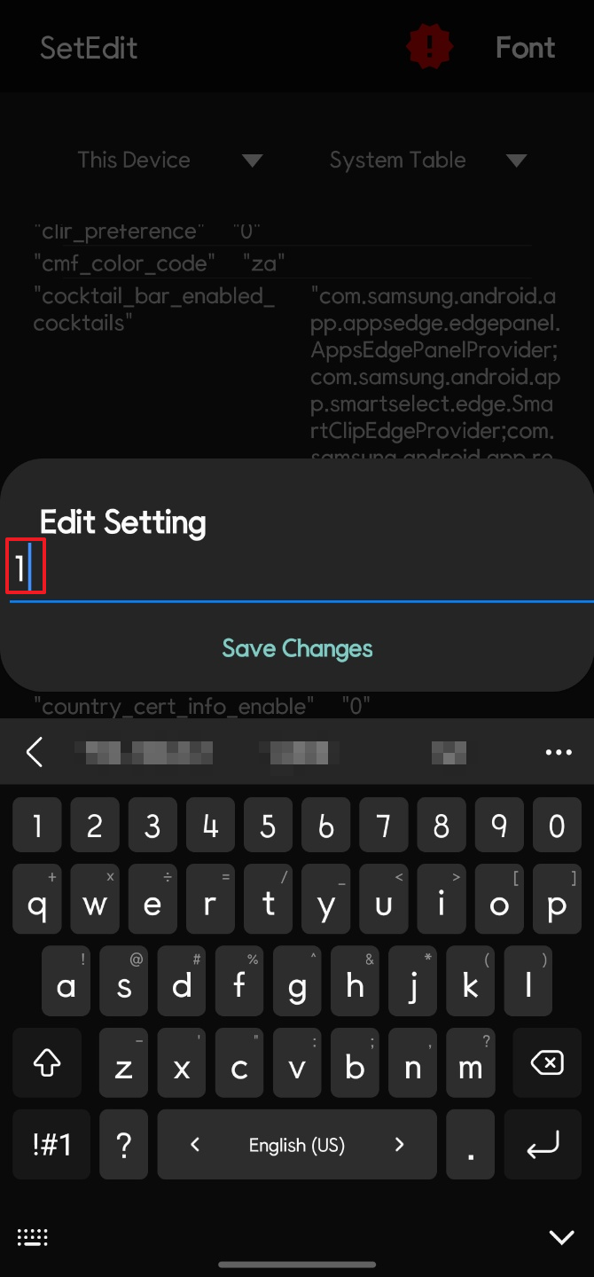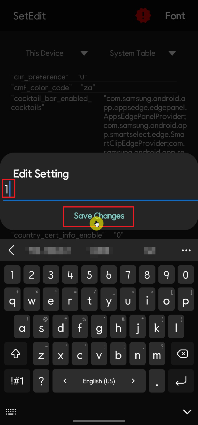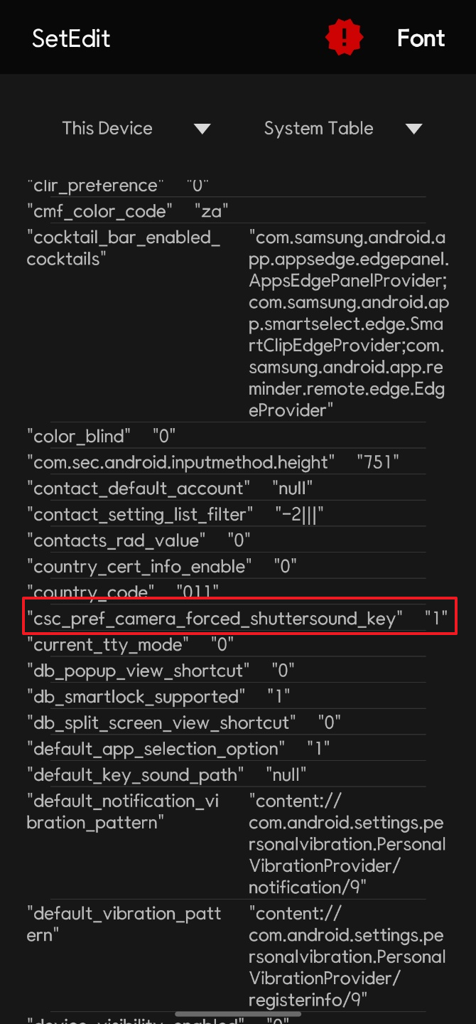 그리고 나오는 창에서 1을 입력하고 Save Changes를 클릭하면 csc_pref_camera_forced_shuttersound_key 값이 1로 설정된 것을 확인할 수 있다.