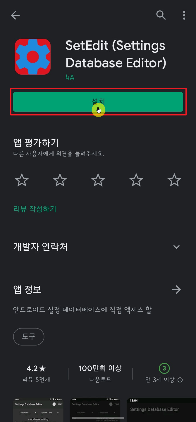 일단 먼저 구글 Play 스토어에서 "SetEdit" 검색 한 다음에 앱을 설치한다. 검색을 할 때 Set까지만 쳐도 자동으로 SetEdit 앱을 추천해 준다.