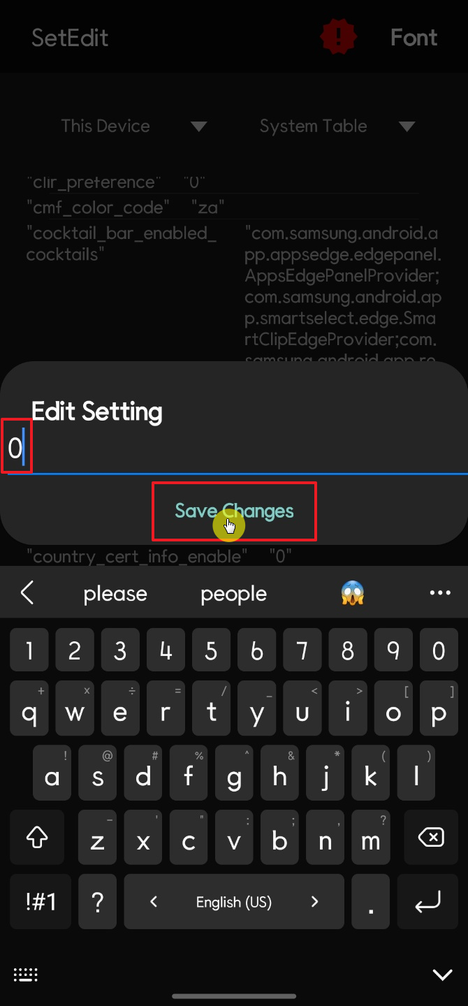 이 값을 0으로 수정하고 Save Changes를 터치하면 된다. 마지막으로 csc_pref_camera_forced_shuttersound_key의 값이 0으로 수정이 된 것 확인되면 끝이다.