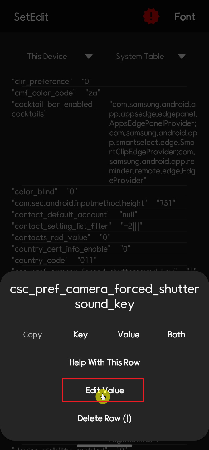 복구하는 방법은 간단하다 SetEdit 앱을 다시 실행시켜서 csc_pref_camera_forced_shuttersound_key 항목을 Value를 다시 1로 변경하면 된다.