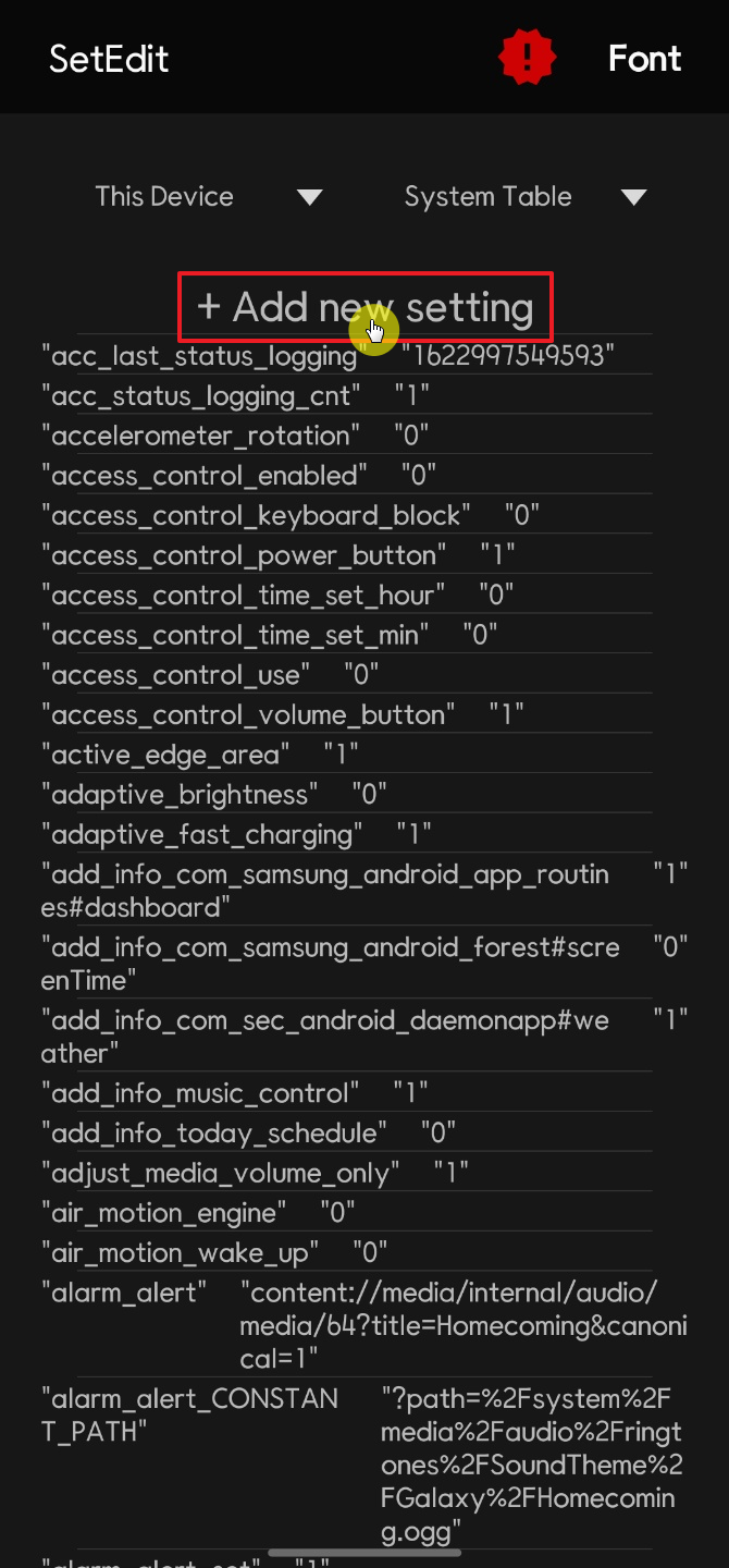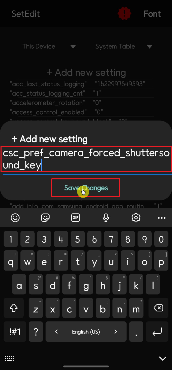 이럴 때는 앱 실행 시 상단에 있는 "+Add new setting"을 터치해서 csc_pref_camera_forced_shuttersound_key 항목을 만들어 주면 된다. "+Add new setting" 터치해서 나오는 창에 csc_pref_camera_forced_shuttersound_key를 입력하고 Save Change를 터치한다.