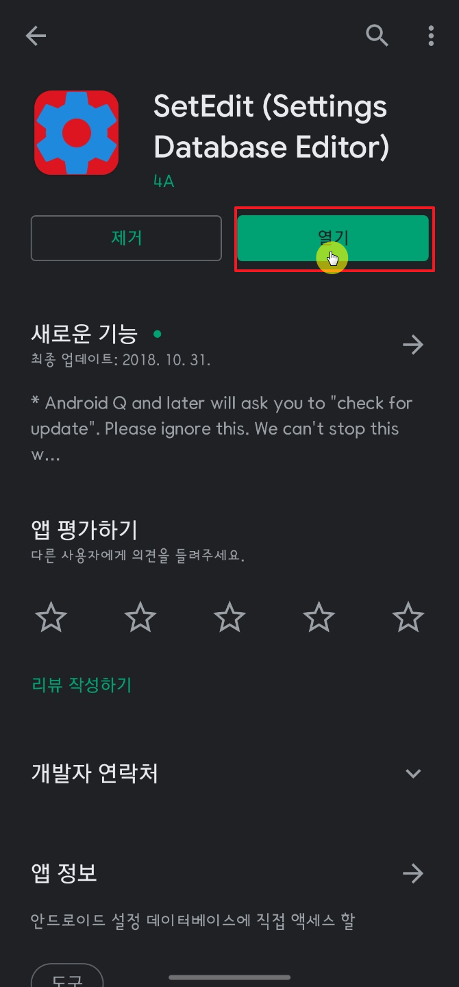 설치가 완료되면 열기를 터치해서 SetEdit 앱을 실행해준다. 앱이 실행되면 오른쪽 사진처럼 메시지가 드는데 확인을 터치한다.