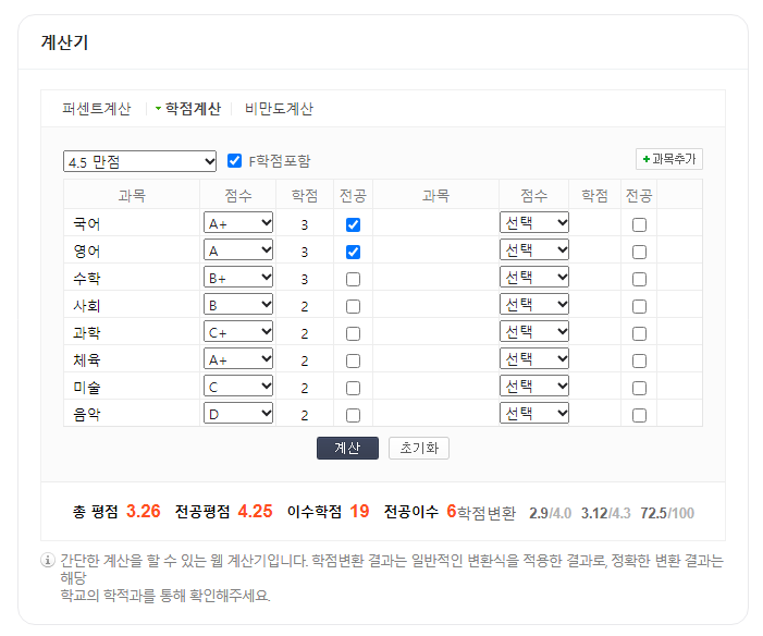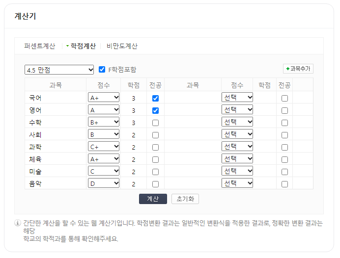 - 계산 실행: 모든 과목 정보를 입력한 후, '계산하기' 버튼을 클릭합니다.