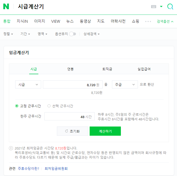 시급 계산을 하기 위해서는 직접 일반 계산기를 뚜들겨도 되겠지만 요즘에는 인터넷을 통해서 손쉽게 계산을 해볼 수 있다. 네이버에서 "시급 계산기"라고 검색을 하면 아래 사진과 같이 시급 계산기가 나온다.