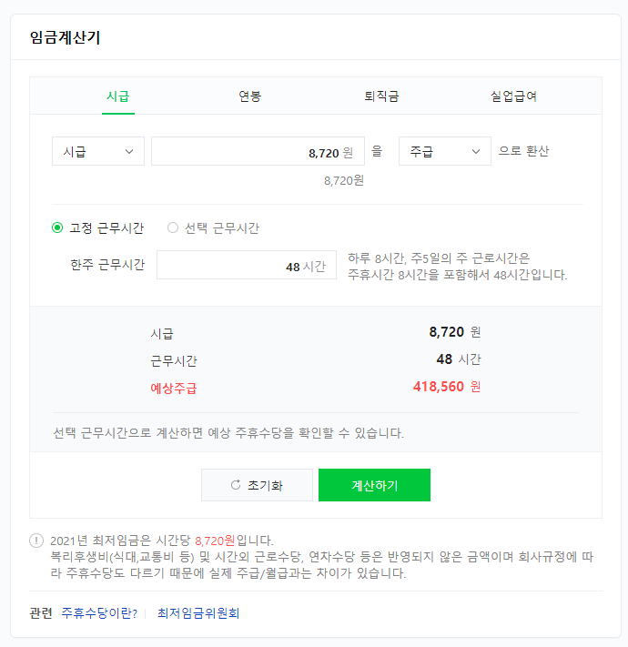 예를 들어 시급 8,720원 한주 근무시간이 48시간으로 계산을 하고 주급으로 표시를 한다면 아래와 같이 나온다. 주마다 418,560원을 받게 되는 것이다.
