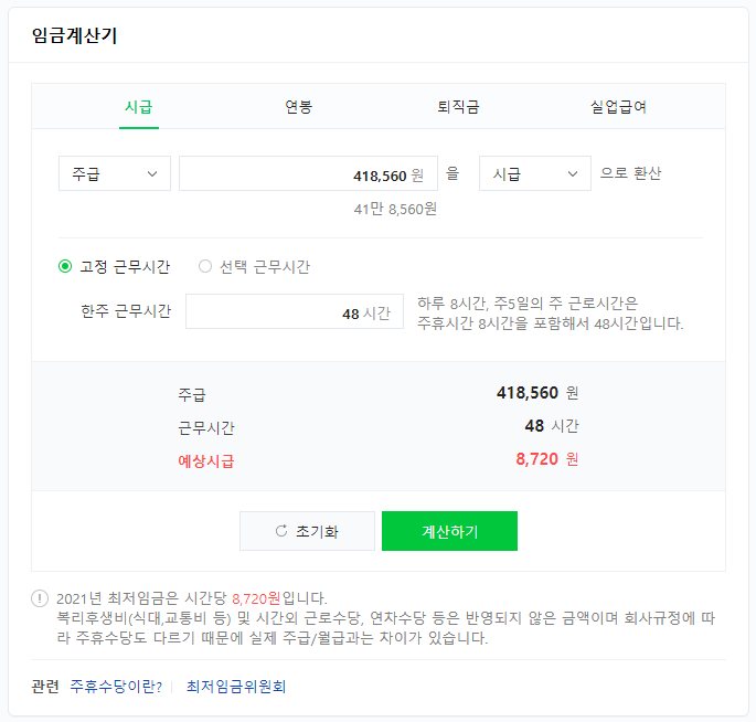 여기에서 본인의 시급과 한주 근무시간을 입력하고 계산하기 버튼을 클릭하면 본인의 주급을 계산해준다.