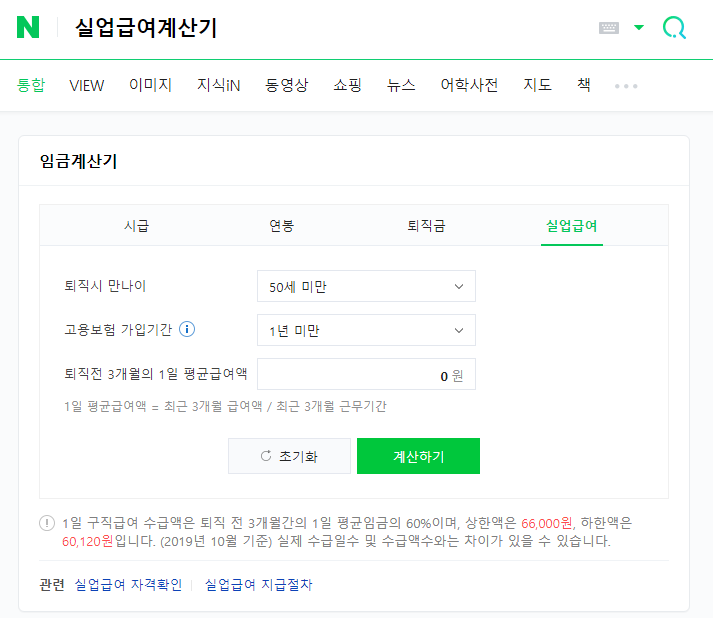 '실업급여계산기'의 네이버 통합검색 결과입니다.