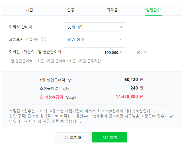 그렇다면 위에서 알아본 실업급여에 대해서 실질적으로 얼마나 받을 수 있는지 한번 계산해보자. 네이버 실업급여 계산기를 이용해 계산해 보겠다.