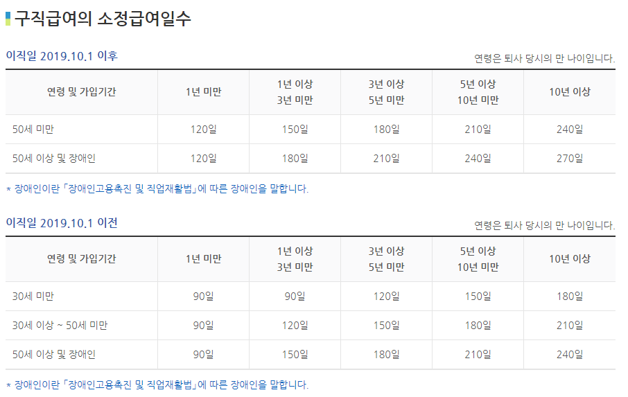 소정 급여일수는 고용보험 가입기간에 따라 차이가 나기 때문에 아래 표를 참고하자.