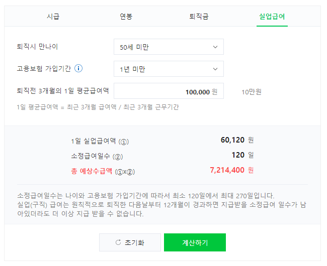 그렇다면 위에서 알아본 실업급여에 대해서 실질적으로 얼마나 받을 수 있는지 한번 계산해보자. 네이버 실업급여 계산기를 이용해 계산해 보겠다.