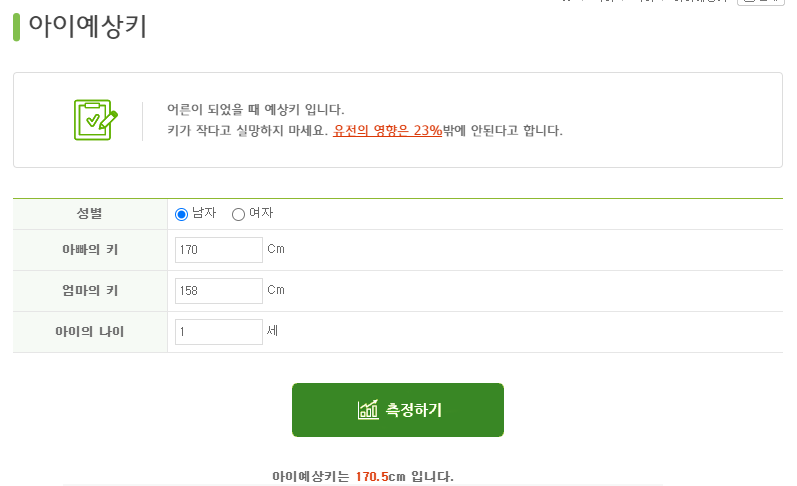 재미있는 것은 아이 예상키를 알아볼 수 있는데 그냥 재미 삼아 알아보는 것 같다. 아빠의 키 엄마의 키를 입력하면 예상해 볼 수 있는데 신빙성이 좀 떨어진다. 아이의 키는 유전의 영향이 23% 밖에 안된다고 하니 재미로만 해보자.