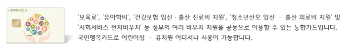 그리고 국민행복카드도 신청이 가능하다. 국민행복카드는 어린이집(보육료 결제), 유치원(유아학비 인증), 건강보험 임신 · 출산 진료비 및 사회서비스 전자바우처 등을 받을 수 있는 카드로 임산부와 부모들에게 필수인 카드이다. 이것도 추후에 시간을 내서 알아보도록 하겠다.