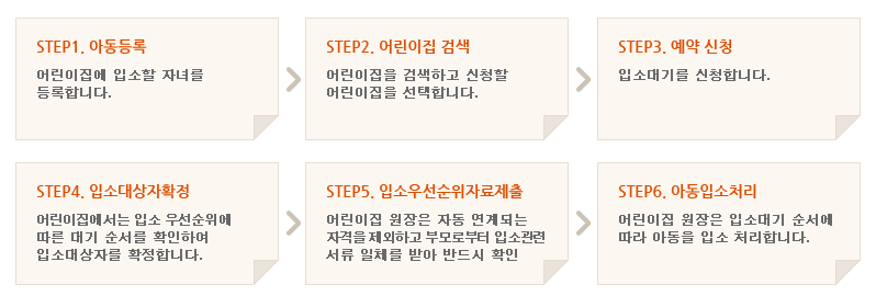 많은 부모들이 이 사이트에 들어오는 주된 이유는 바로 어린이집 입소대기를 하기 위해서 일 것이다. 이 어린이집 페이지에서 입소대기 신청을 할 수 있다. 아래 사진은 어린이집 입소대기 신청의 절차이다. 추후에 한번 시간을 내서 어린이집 입소대기 신청하는 방법에 대해서도 알아봐야겠다.