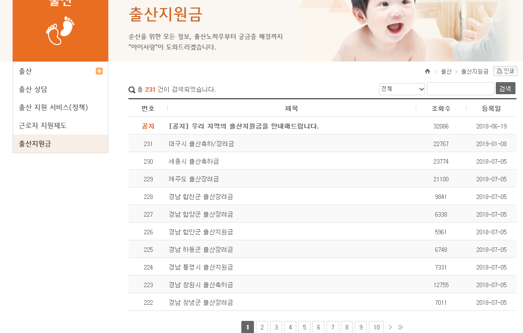 출산 페이지는 출산 전과 출산 후에 필요한 정보들을 담고 있다. 출산 준비, 분만의 종류, 수산 노하우, 산후관리, 산후 우울증, 난산의 위험, 출산 예정일에 대해서 상당한 정보들을 확인할 수 있다. 출산 상담 메뉴가 있어 게시글을 남겨 상담도 받아볼 수 있는 것 같다. 그리고 정부에서 지원하는 출산 지워 서비스와 근로자 지원제도를 확인해볼 수 있고 각 지자체별로 다른 출산지원금도 확인해볼 수 있다. 각 지자체 별로 다르기 때문에 본인이 거주하는 곳의 지원금을 확인해보는 것을 추천한다.