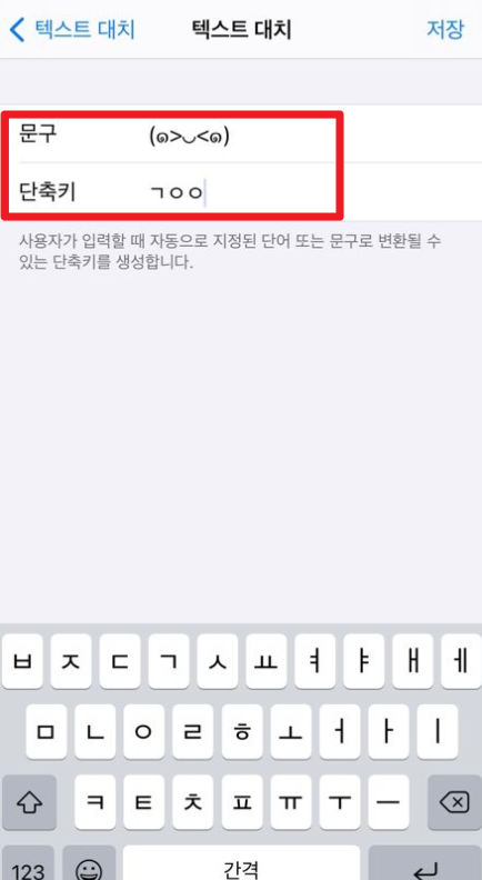 설정 → 일반 → 키보드 텍스트 대치 → + → 문구와 단축키 입력 후 → 저장