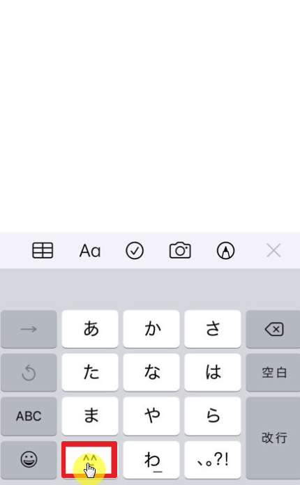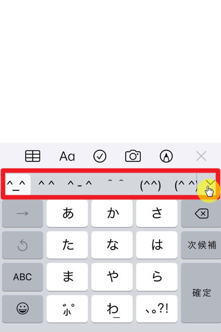 Kana 키보드를 추가했다면 Kana 키보드를 사용할 수 있다. Kana 키보드를 사용하는 방법은, 키보드의 왼쪽 아랫부분의 지구 모양의 아이콘을 길게 터치하면 나오는 항목에서 일본어로 써져있는 부분을 터치하고 왼쪽 아래의 "^_^"를 터치하면 이모티콘들이 키보드 위에 나오게 된다.