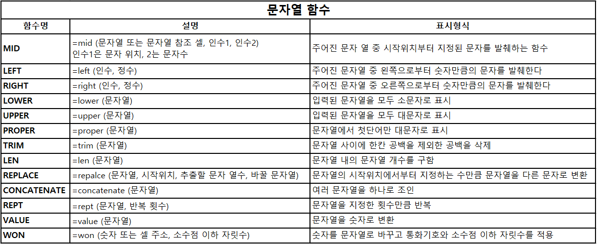 | MID | =mid (문자열 또는 문자열 참조 셀, 인수1, 인수2) 인수1은 문자 위치, 2는 문자수 |