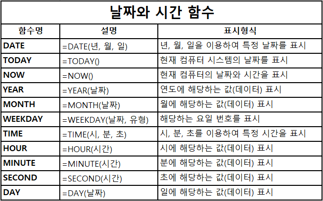 | DATE | =date(년, 월, 일) | 년, 월, 일을 이용하여 특정 날짜를 표시 |