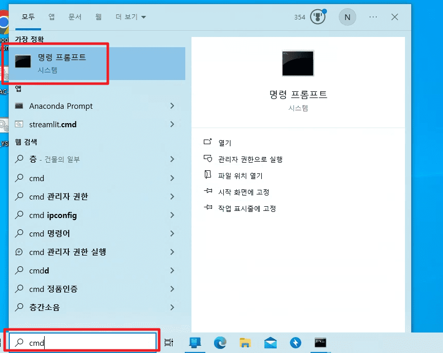 - "cmd"를 입력하거나 작업표시줄에 "cmd"를 검색하여 명령 프롬프트를 실행합니다.