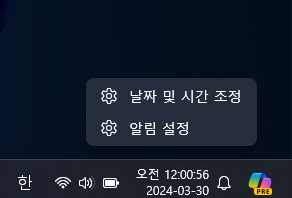 - 작업표시줄의 날짜 및 시간 부분을 마우스 오른쪽 클릭하여 설정 메뉴에 접근합니다.