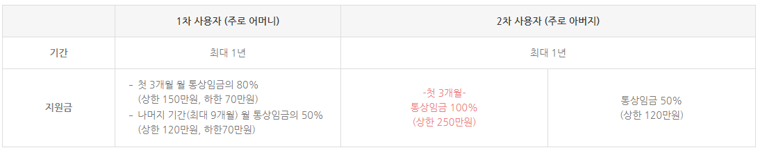 같은 자녀에 대하여 부모가 순차적으로 육아휴직을 사용하는 경우, 두 번째 사용한 사람의 육아휴직 3개월 급여를 통상임금의 100%(상한 250만 원)로 상향하여 지급한다. 4개월부터 육아휴직 종료일까지는 통상임금의 50%를 지급한다.