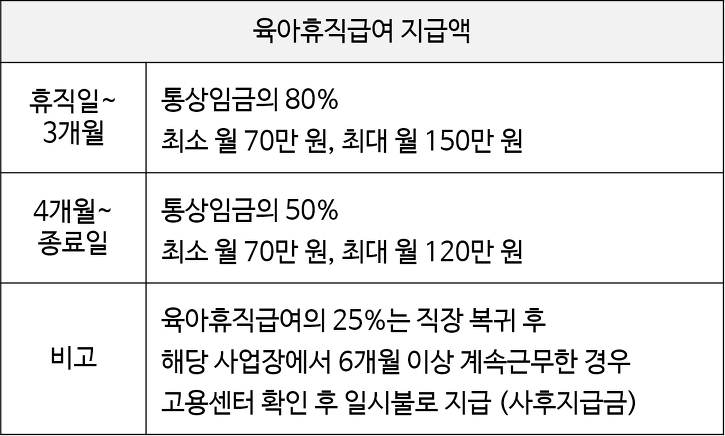 육아휴직 시작일부터 첫 3개월까지는 통상임금의 80%(상한액 : 월 150만 원, 하한액 : 월 70만 원), 4개월부터 종료일까지는 통상임금의 50%(상한액 : 월 120만 원, 하한액 : 월 70만 원)를 유아휴직 급여액으로 지급한다. 단, 육아휴직 급여액 중 일부(25%)를 직장복귀 6개월 후에 합산하여 일시불로 지급한다.