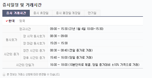 우리나라 주식시장의 기본적인 거래 방식과 시간은 위 표와 같다. 주식 정규장은 오전 9시부터 오후 3시 30분까지 이다. 하지만 실질적으로 주식을 거래할 수 있는 시간은 오전 8시 30분부터 오후 6시까지이다. 정규장 시간 외에는 거래량이 많지 않아 사람들이 잘 사용하지 않는 것이다.