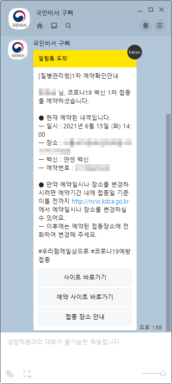 그리고 나는 위에서 알림을 카카오톡으로 선택을 해서인지 카카오톡으로도 예약 결과를 알려줬다.