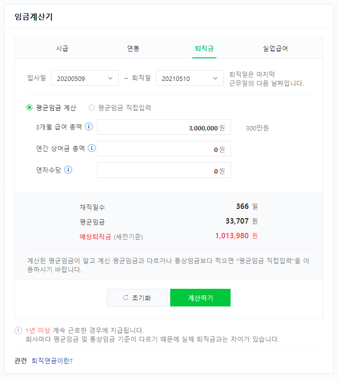 그럼 한번 해보자. 3개월 급여 총액을 300만 원이라고 가정하고 1년 동안 근무했다고 하고 계산을 하면 아래와 같이 나온다.