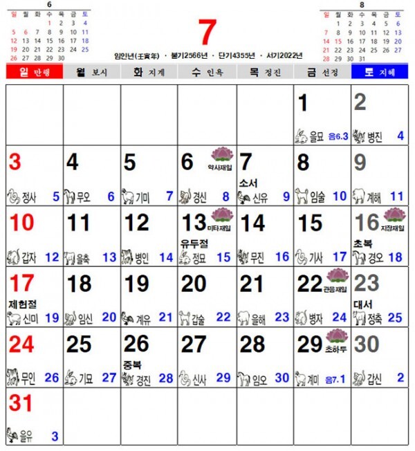2022년 7월 불교 달력, 일진 달력, 음력 달력