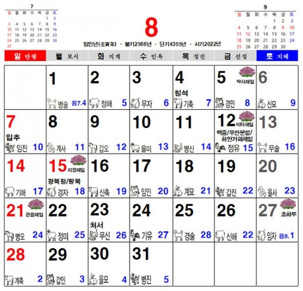 2022년 8월 불교 달력, 일진 달력, 음력 달력