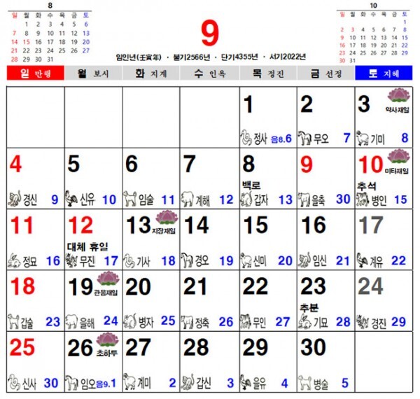2022년 9월 불교 달력, 일진 달력, 음력 달력