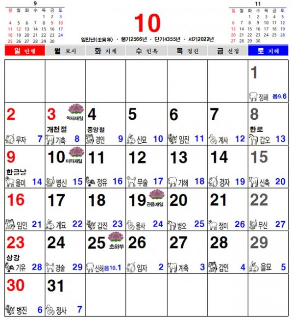 2022년 10월 불교 달력, 일진 달력, 음력 달력