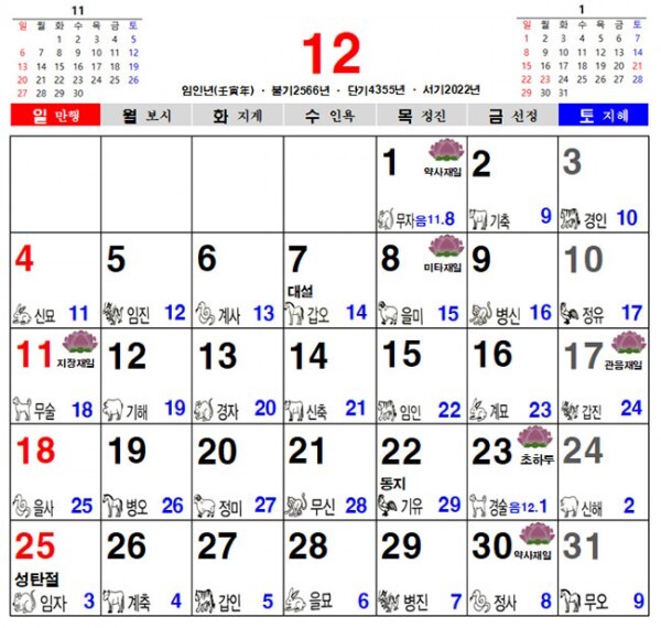 2022년 12월 불교 달력, 일진 달력, 음력 달력
