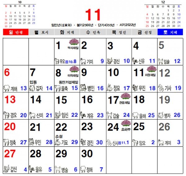 2022년 11월 불교 달력, 일진 달력, 음력 달력