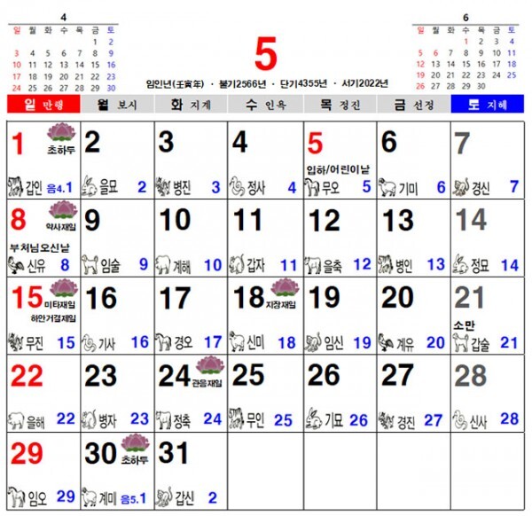 2022년 5월 불교 달력, 일진 달력, 음력 달력