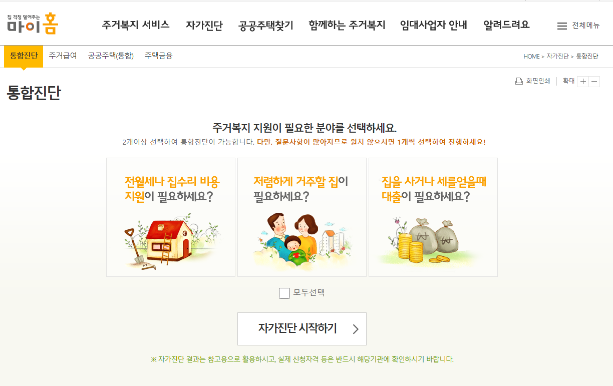 마이홈 홈페이지는 위 사진과 같은 화면을 하고 있다. 마이홈 홈페이지에서는 이용자의 상황에 맞는 주거복지를 찾아볼 수 있는데 가장 많이 사용하는 서비스는 자가진단이라는 서비스이다. 자가진단 서비스는 몇 가지 항목을 입력하여 해당되는 서비스를 찾아주거나 현 상태를 진단해주는 서비스이다.