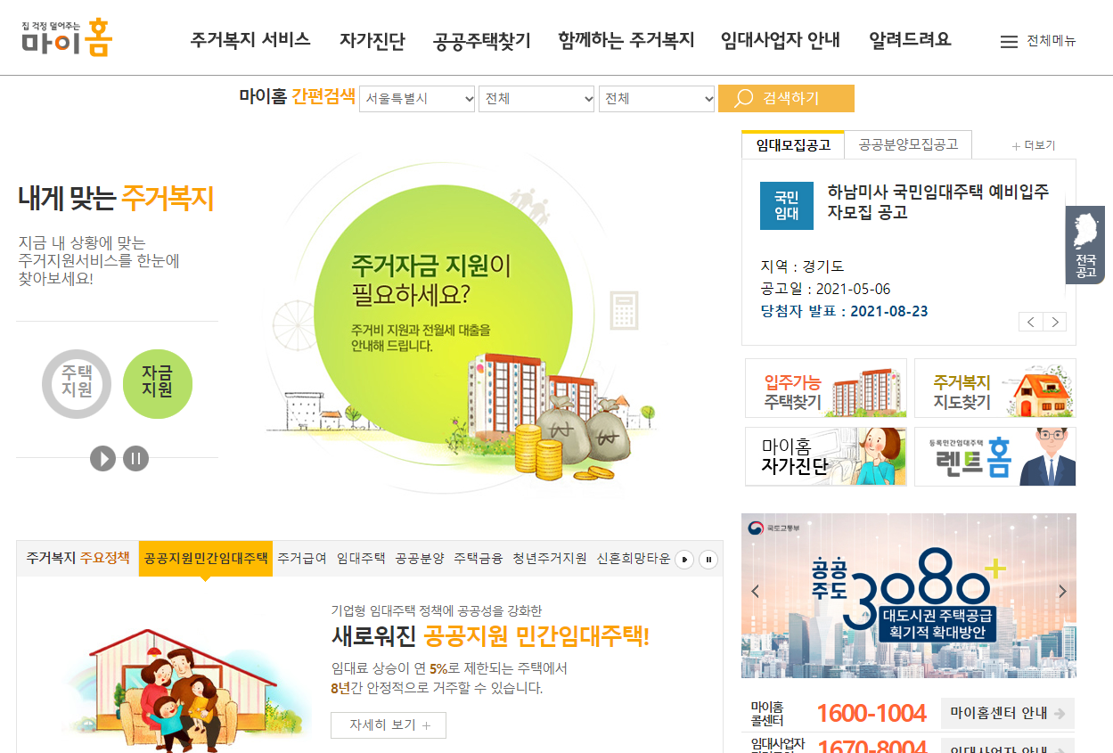 마이홈 홈페이지는 주거복지에 관한 서비스들을 한눈에 찾아볼 수 있는 사이트이다. 아래 링크는 마이홈 홈페이지의 링크이다.