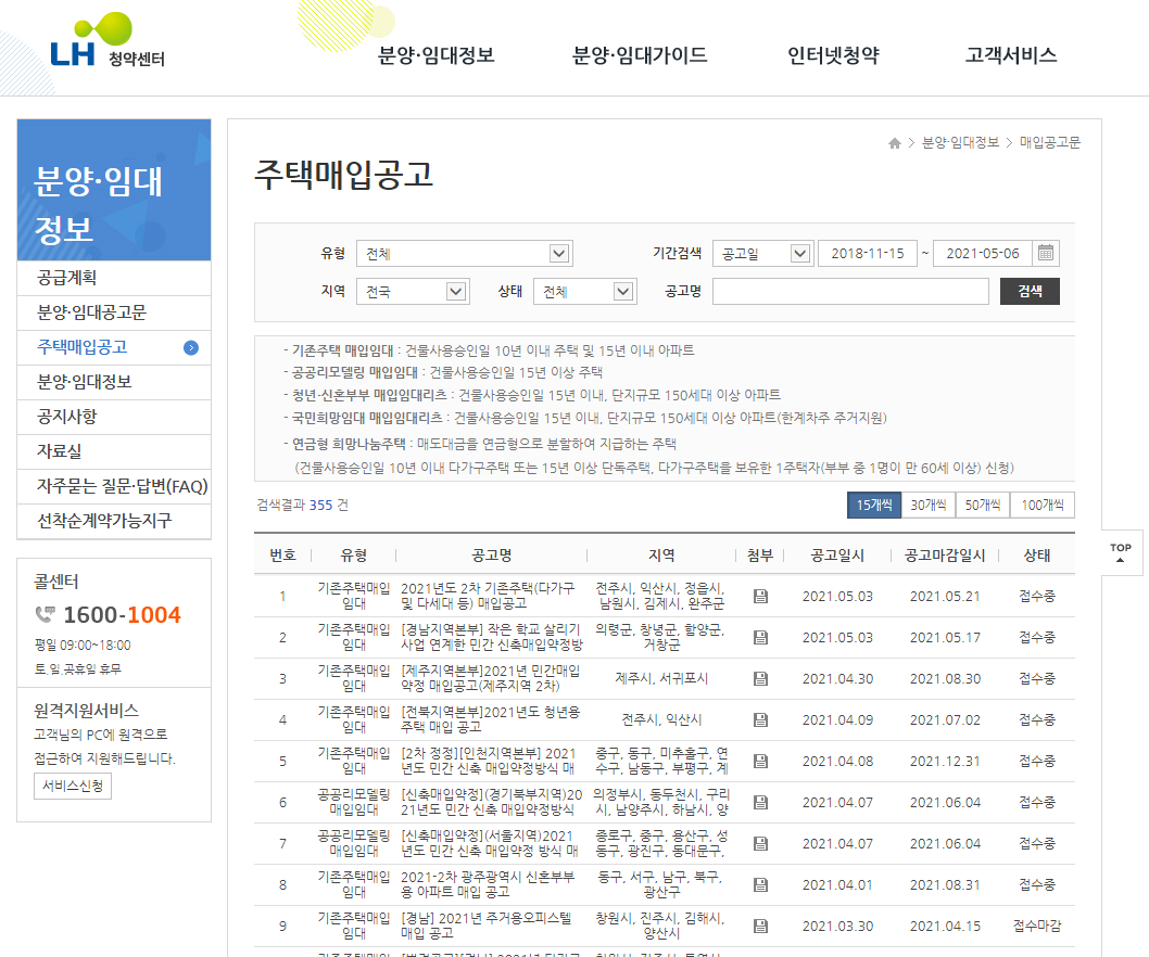 주택 매입은 LH 청약센터 홈페이지에 포함되어있는 하부 페이지라고 보는 게 더 맞을 듯하다. 아래 링크가 LH 청약센터 홈페이지 안에 있는 주택 매입 정보를 보는 페이지 링크이다.